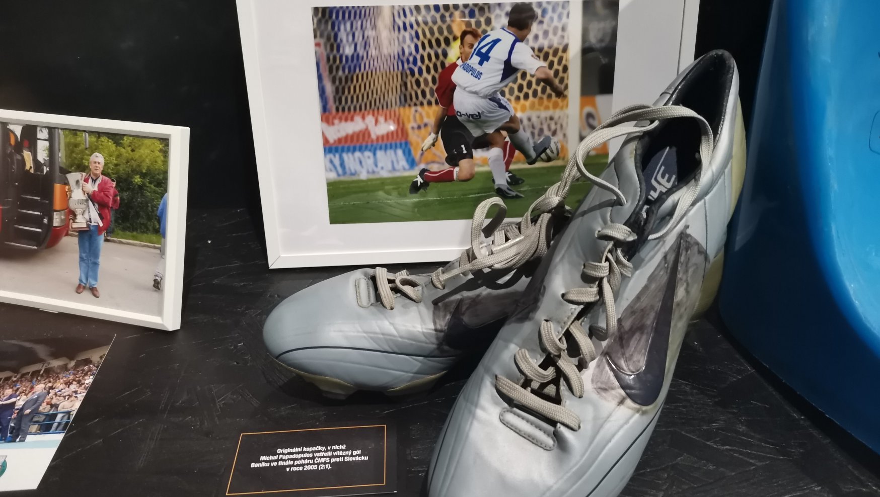 Exponát, jehož jsou kopačky tou zásadní součástí, je doplněn i momentkou, která zachycuje právě okamžik, kdy Michal Papadopulos obstřelem překonává Petra Drobisze, což Baníku přineslo zatím poslední velkou trofej.